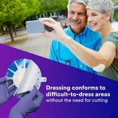 Designed with patient comfort in mind, the dressing is soft and conformable. It provides a waterproof seal that allows for showering. This adhesive foam dressing can be used as a primary dressing for low to highly exuding partial and full thickness dermal wounds including pressure ulcers/injuries, abrasions, neuropathic ulcers/diabetic foot ulcers (DFU), arterial ulcers/ischemic, skin tears, surgical wounds, trauma and venous leg ulcers (VLU). It is also suitable for use as a secondary dressing in conjunction with wound fillers, such as gauze or alginate dressings and can be used with or under compression therapy.