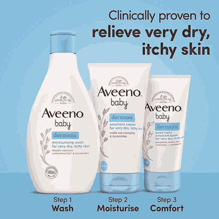 Apply to the whole body during periods of irritation at least once at night as needed. For a complete routine use with AVEENO® Baby Dermexa Moisturising Wash and apply AVEENO® Baby Dermexa Emollient Cream to help prevent skin dryness and itchy sensations.
