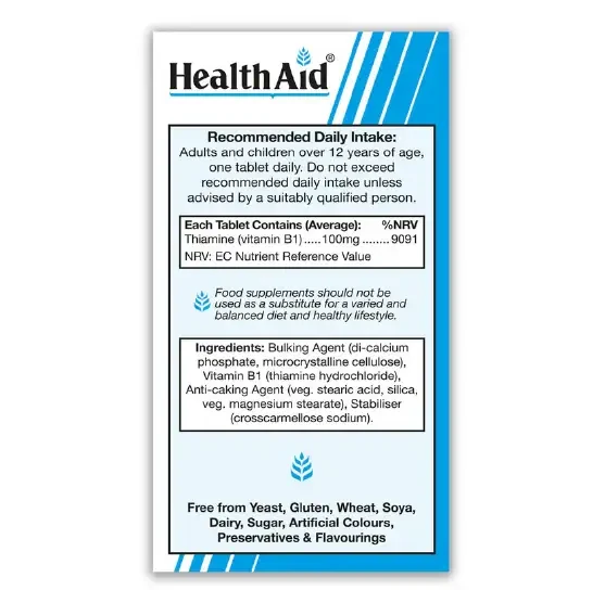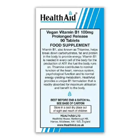 Vitamin B1, also known as Thiamine, helps breakdown carbohydrates, fat and protein in the body to provide energy. Vitamin B1 is needed in every cell of the body for the production of ATP, the fuel the body runs on. Thiamine contributes to normal function of the heart, nervous system, psychological function, and normal energy-yielding metabolism. HealthAid® provides a unique B1 formulation that is readily absorbed for maximum utilisation and benefit to the body.