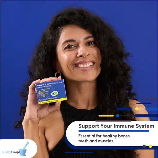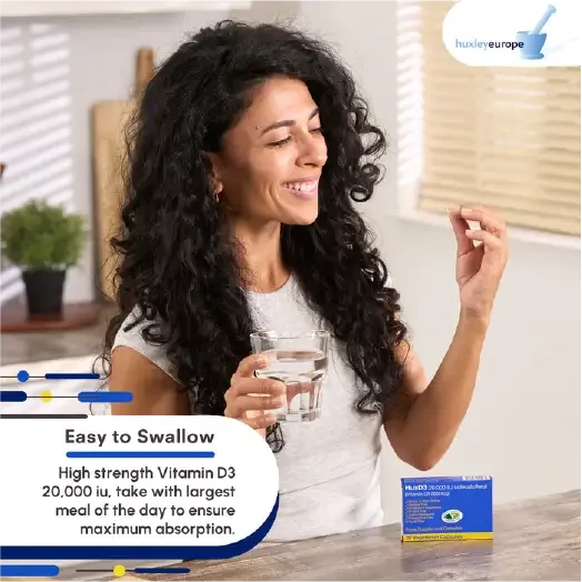take one capsule every two weeks or as directed. These easy to swallow capsules can be chewed or burst open, the contents are flavour free. HuxD3 should be taken with the largest meal of the day to ensure maximum absorbtion.