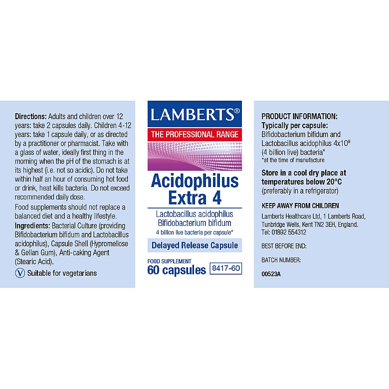 Lamberts® Acidophilus Extra 10 contains 10 billion friendly bacteria. We use the beneficial Lactobacillus acidophilus and Bifidobacterium strains of bacteria. Lamberts® was one of the first companies to produce live bacteria capsules in the UK (over 30 years ago) and we have developed expertise in this area. To ensure proven targeted release for acid-sensitive ingredients such as live bacteria, we have: