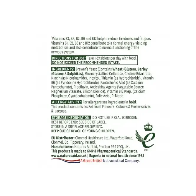 Brewer’s Yeast (Contains Wheat (Gluten), Barley (Gluten) & Sulphites), Microcrystalline Cellulose, Choline Bitartrate, Niacin (as Nicotinamide), Inositol, Thiamin (as Hydrochloride), Vitamin B6 (as Pyridoxine Hydrochloride), Pantothenic Acid (as Calcium Pantothenate), Riboflavin, Anticaking Agents (Vegetable Source Magnesium Stearate, Silicon Dioxide), Vitamin B12 Prep. (Calcium Phosphate, Cyanocobalamin), Folic Acid, D-Biotin.