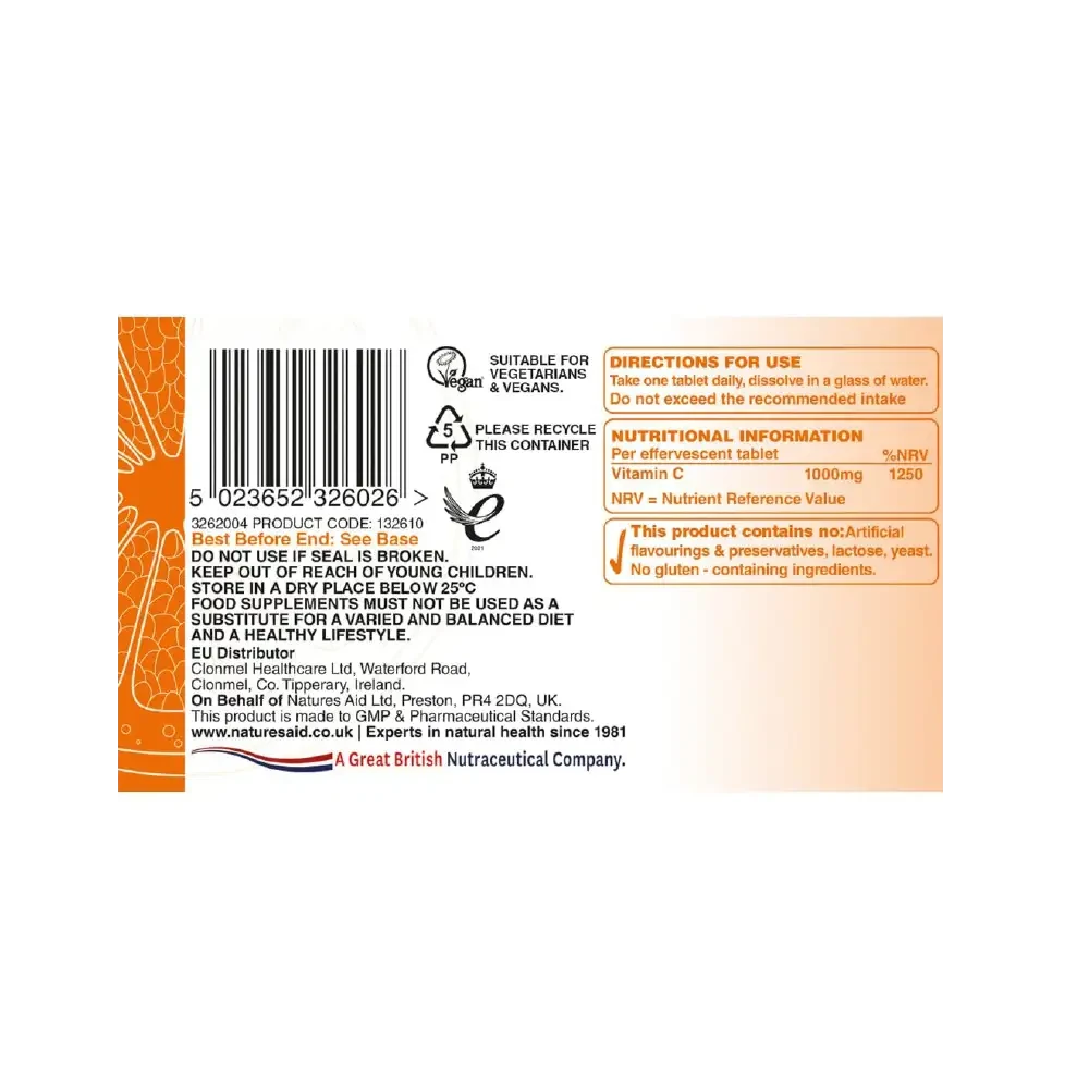 Vitamin C plays a role in many important bodily functions, it is an essential nutrient and therefore should be consumed daily. Maintaining healthy Vitamin C levels will help to support the normal function of the immune system and healthy energy-yielding metabolism.Vitamin C can be absorbed from a balanced diet, with foods such as oranges, red peppers, blackcurrants, broccoli, and sweet potato providing an excellent source. Many people find it difficult to track their daily nutritional intake and therefore may choose a Vitaminsupplement to ‘top up their diet. An effervescent tablet is a particularly handy and refreshing way to include supplements in your daily routine.At Natures Aid, our Effervescent Vitamin C has been carefully formulated by our expert nutritionists to provide 1000mg of Vitamin C in each convenient dissolvable tablet, ideal for those who may struggle swallowing pills. Our vegan friendly Effervescent Vitamin C has a refreshing orange taste and contains no added sugar, artificial colours or artificial flavours. What’s more, you can rest assured our Effervescent Vitamin C tablets are free from GMO, dairy, gluten, soya and nuts.Simply drop one tablet into a glass of water, allow it to dissolve and enjoy a pleasant and refreshing drink which will provide your body with Vitamin C to help support a healthy immune system. A perfect addition to your morning routin
