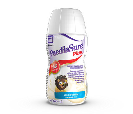 PaediaSure Plus is suitable for the dietary management of children weighing 8 - 30 kg with, or at risk of developing, disease-related malnutrition. PaediaSure Plus provides 1.5 kcal/ml and is available both as a 500 ml ready-to-hang tube feed and as a 200 ml oral nutritional supplement (ONS). PaediaSure Plus ONS is ready-to-drink and available in four flavours: banana, strawberry, unflavoured and vanilla.