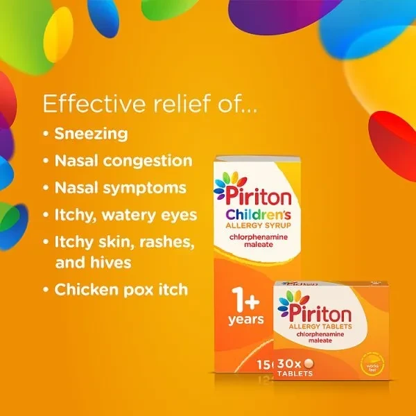 Piriton Allergy Tablets are used to treat the allergic symptoms (runny or itchy nose with or without stuffiness) caused by hayfever and other allergies e.g. pet and house dust mite allergies. They relieve itchiness, redness, swelling, tenderness and irritation associated with many allergic skin problems. Piriton Allergy Tablets also relieves the itchy skin rash of chickenpox.