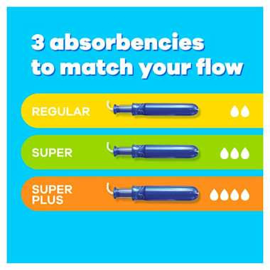 When using tampons, it's important to choose the lowest absorbency necessary for your menstrual flow. And because the amount of flow varies from day to day, it's likely that you will need to use different absorbencies on different days of your period. Selecting the right absorbency comes with experience, but as a guide, if a tampon absorbs as much as it can and has to be changed before 4 hours, then you may want to try a higher absorbency. On the other hand, if you remove a tampon and after 4-6 hours white fibre is still showing, you should choose a lower absorbency. "