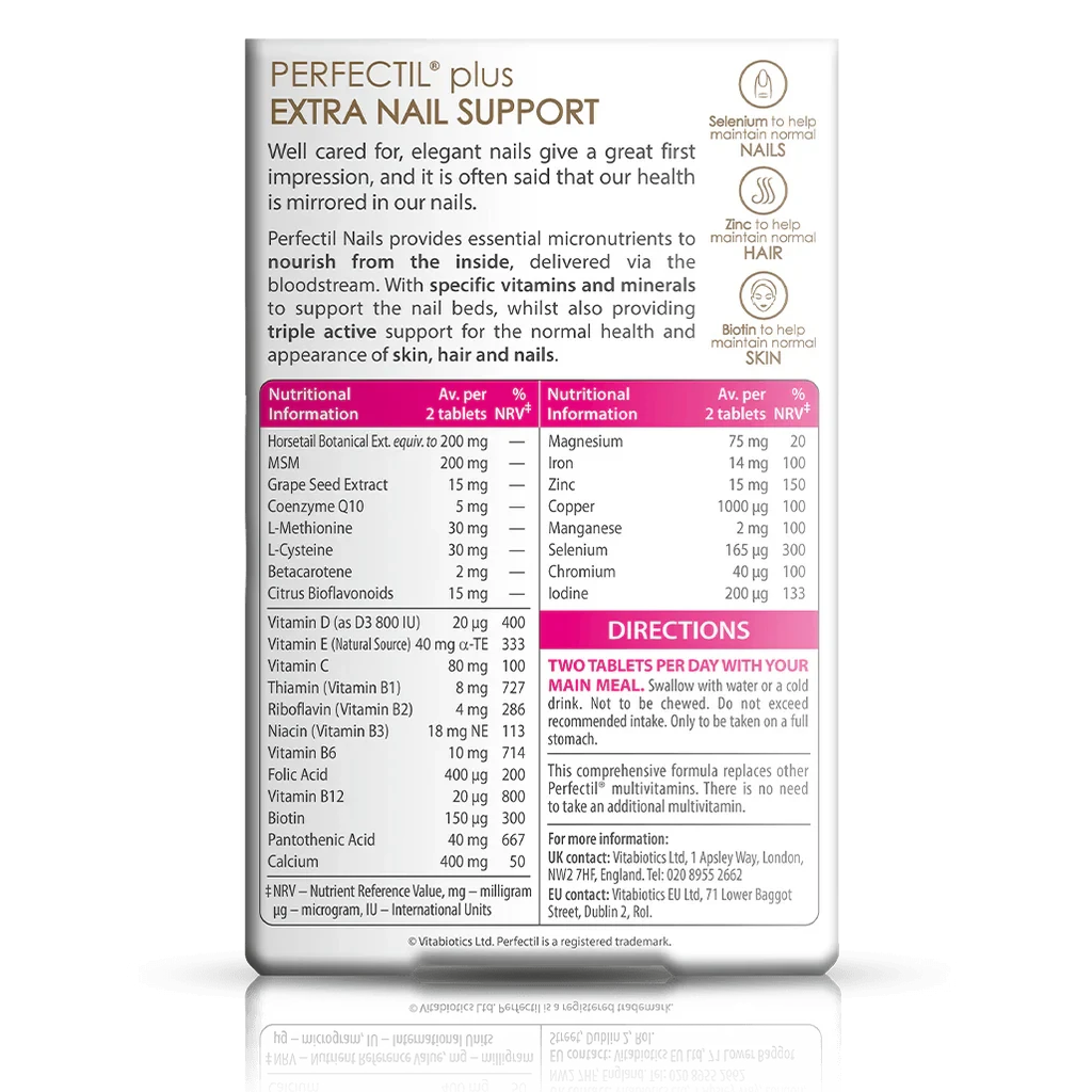 Perfectil Nails provides your skin, hair and nails with a comprehensive spectrum of the essential bio-active nutrients. As well as benefiting these areas, Perfectil Nails also safeguards your diet by doubling up as a complete multivitamin for all round health. There is no need to take an additional multivitamin."