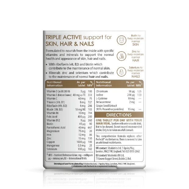 We all want to do the best that we can for our health and appearance. Vitabiotics knows only too well that what you put inside your body has an enormous impact on your internal health and your outer appearance. Therefore, Perfectil has been formulated by an expert team to deliver ""beauty from within"" and is designed to complement your daily skin and hair care routine with a range of over 20 micronutrients.
