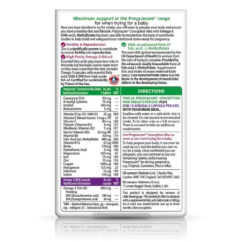 Pregnacare Conception Max provides L-Methylfolate, an advanced form of folic acid, plus a high purity Omega-3 fish oil capsule providing essential fatty acids DHA and EPA. The advanced, carefully balanced, formulation provides increased levels of nutrients compared to Pregnacare Conception: Vitamin B12, Vitamin D, Selenium, Magnesium, Coenzyme Q10, N-Acetyl Cysteine and Inositol. It also includes zinc which is scientifically proven to contribute to normal fertility and reproduction.
